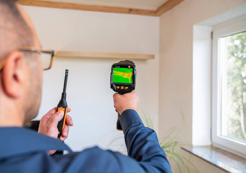 使用德圖熱像儀特有的表面濕度成像功能,在熱像儀顯示屏上以“交通信號燈”的方式顯示熱薄弱點的發霉風險。 在熱圖中直接呈現霉變隱患區域、可以連接溫濕度儀