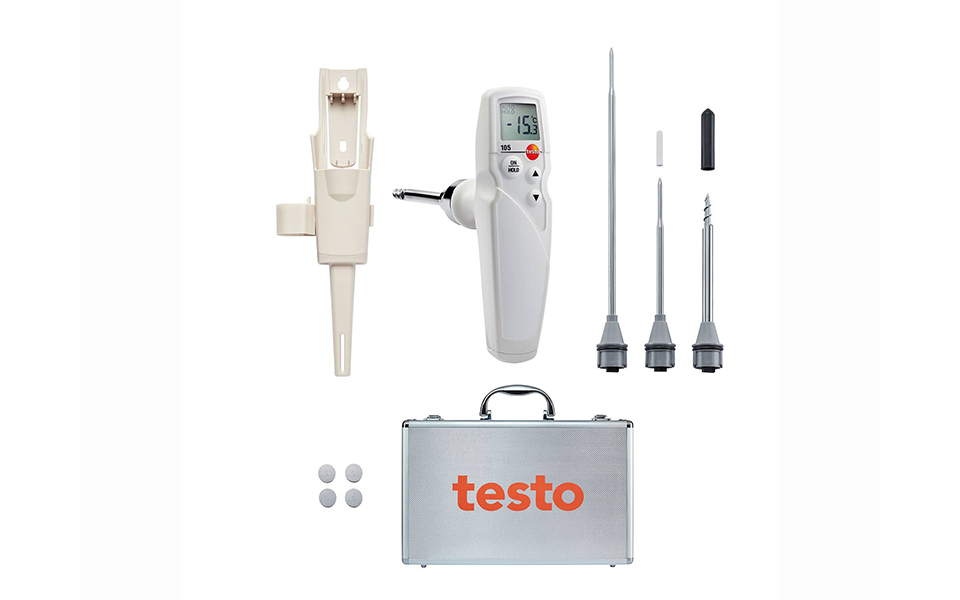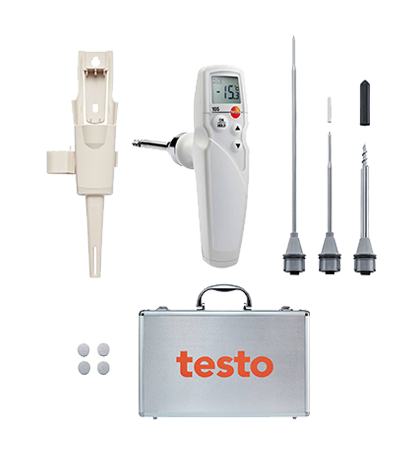1 個(gè) testo 105 手持式溫度計(jì)包括標(biāo)準(zhǔn)測量頭、冷凍食品測量頭、加長測量頭、腰帶/墻面支架、電池和鋁制儀器箱。
