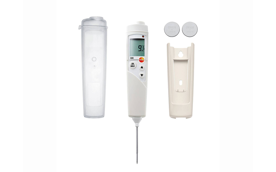 testo 106 食品溫度測量儀是食品領域實用測量工具,包含防水保護軟套和支撐夾等附件。
