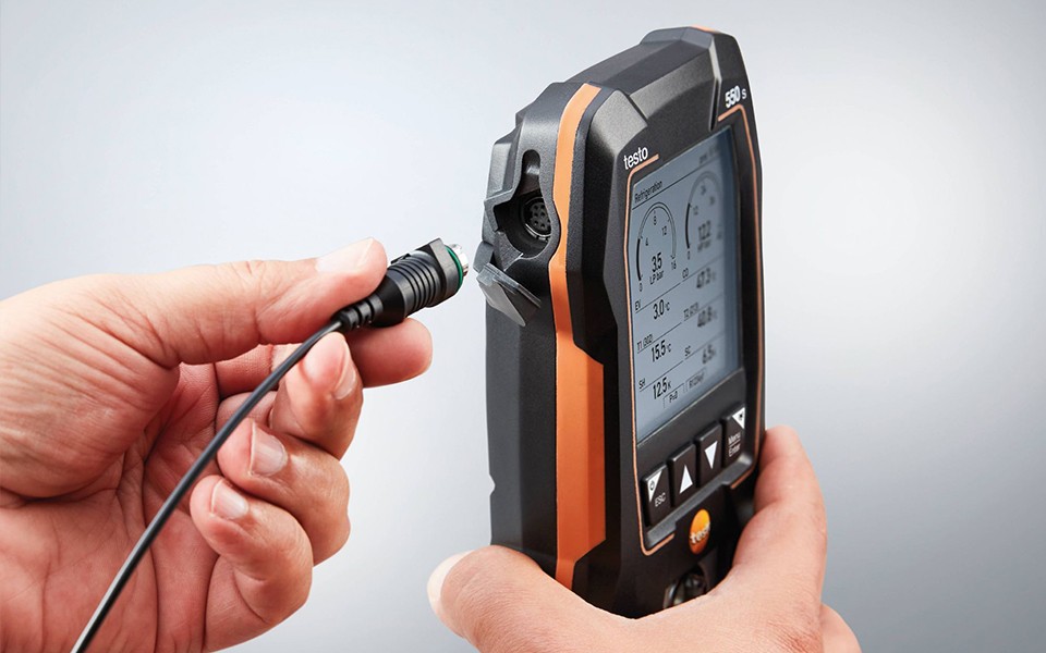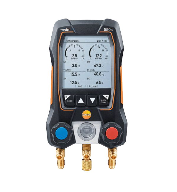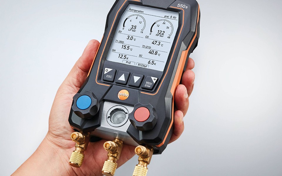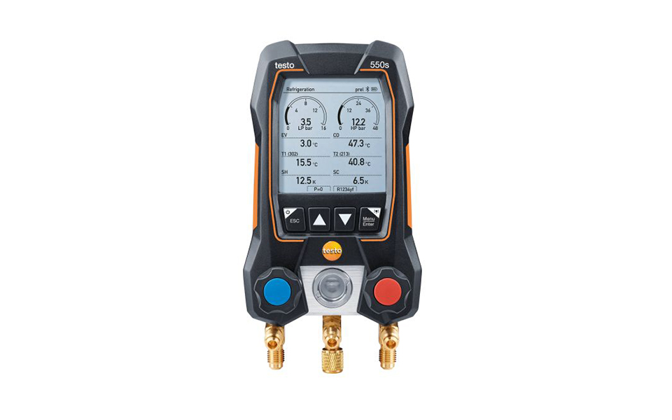 藍牙和雙通閥組的testo 550s數字冷媒表具有超大顯示屏,緊湊堅固的機殼,簡潔的測量菜單和testo Smart App。專業的測量技術,高度的可靠性和智能應用程序,可快速和輕松地進行測量和記錄,適用于調試,保養和維護制冷系統以及熱泵。
