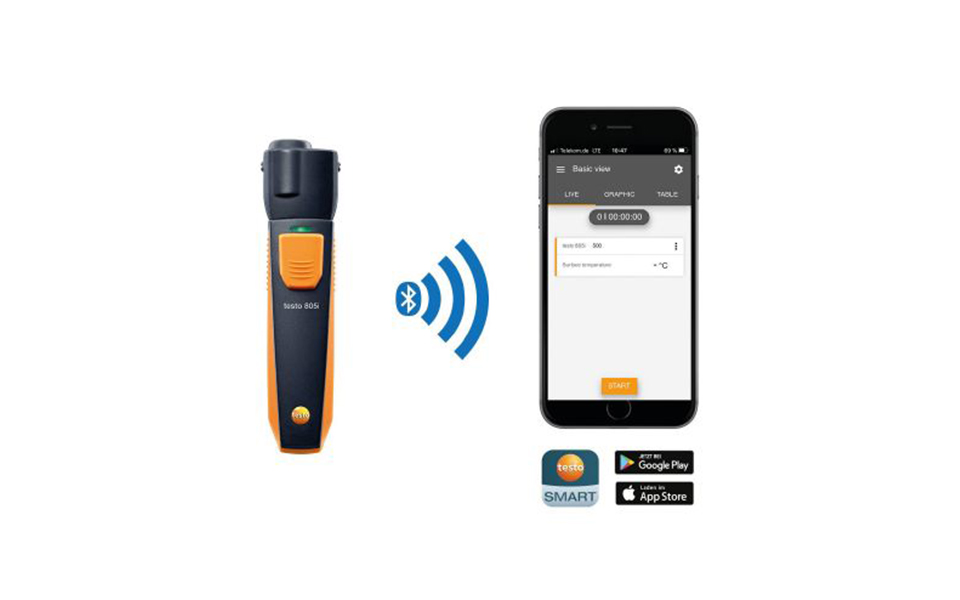 testo 805i 智能無線迷你紅外測溫儀用于測量墻體溫度、空調系統的保險絲和元件溫度。測量點可以由一個8點激光圈進行清晰標示,讓您始終精確掌握測量位置。